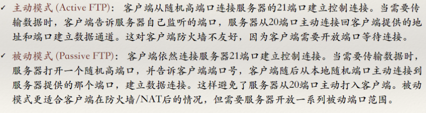 - 数据连接,用于传输文件数据,在需要传输文件或目录列表时建立,完成后关闭,默认情况下使用20,但实际端口可能变化(见下述主动/被动模式)