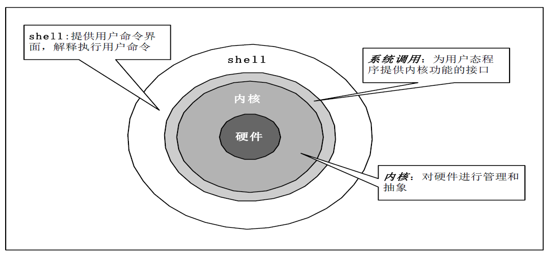 Linux内核(Kernel)作为操作系统,其主要仅用于管理与驱动硬件,而要使用硬件时,就得需要通过应用软件或者是shell的功能来调用操作系统操纵硬件工作。shell作为一种高级程序设计语言,是Linux系统的用户界面,提供了用户与内核进行交互操作的一种接口。它接收用户输入的命令并把它送入内核去执行。硬件、内核、系统调用与shell四者的关系与作用如下图所示:
