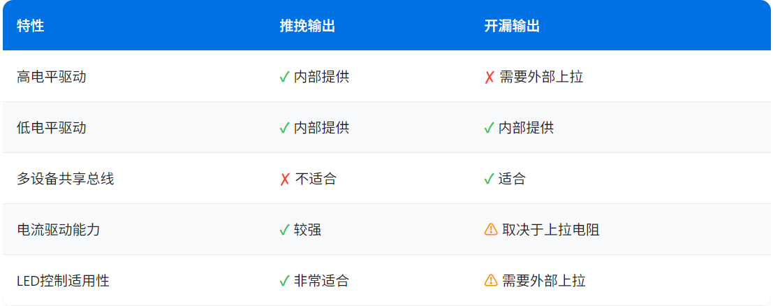 就好像一个有两个“小助手”的电路控制模式。 在这种模式下,当要输出高电平时,其中一个“小助手”(上拉晶体管)会把引脚连接到电源,让引脚输出高电平;而当要输出低电平时,另一个“小助手”(下拉晶体管)会把引脚连接到地,让引脚输出低电平。这两个“小助手”相互配合,一个负责拉高电平,一个负责拉低电平,就像两个人在推和拉一个东西一样,所以叫推挽输出模式。这种模式能很好地控制引脚输出稳定的高低电平,并且具有较强的驱动能力。用于控制LED,继电器,开关,信号输出等。