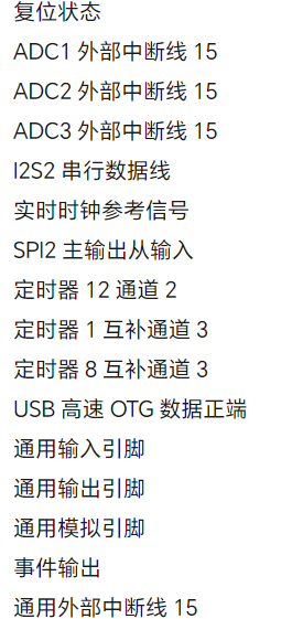 复用功能:将引脚配置为某个外设的备用功能,如UART、SPI或I2C等。(一个引脚可够配置多个功能,但只能同时选择一个功能)