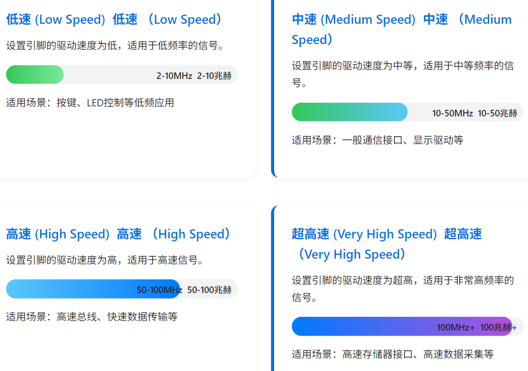 输出速度:合理配置,高速=高功耗+强电磁干扰+快信号变化时间,led用低速就行了。