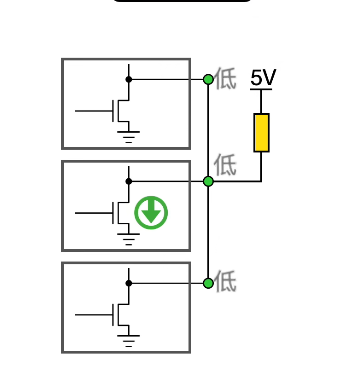 个人理解:就好像只要有一个人饿(接地),就不会做饭(引脚不会拉高电平),只有当所有人都不饿(都不接地),才会做饭(引脚拉高电平),ps:最出生的一集。饿就是肚子空空,接入地线,一点电子都没有。