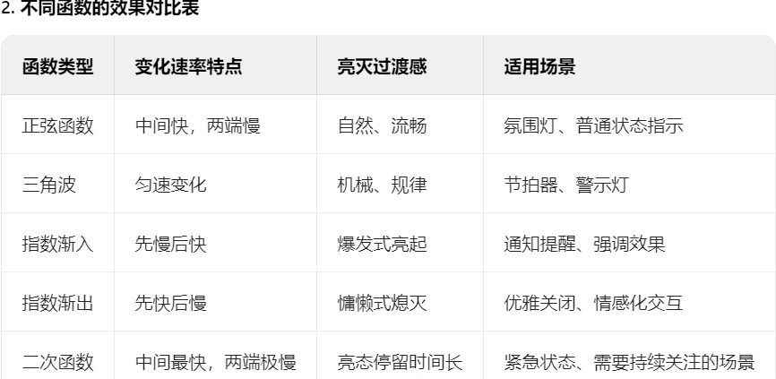 亮度曲线: 除了正弦函数,还能用什么函数来计算亮度?比如三角波?或者指数函数?效果会有什么不同?(提示:呼吸的“感觉“会不一样)