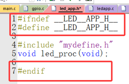 - `#define LED_APP_H`定义了`LED_APP_H`宏,防止重复引用。