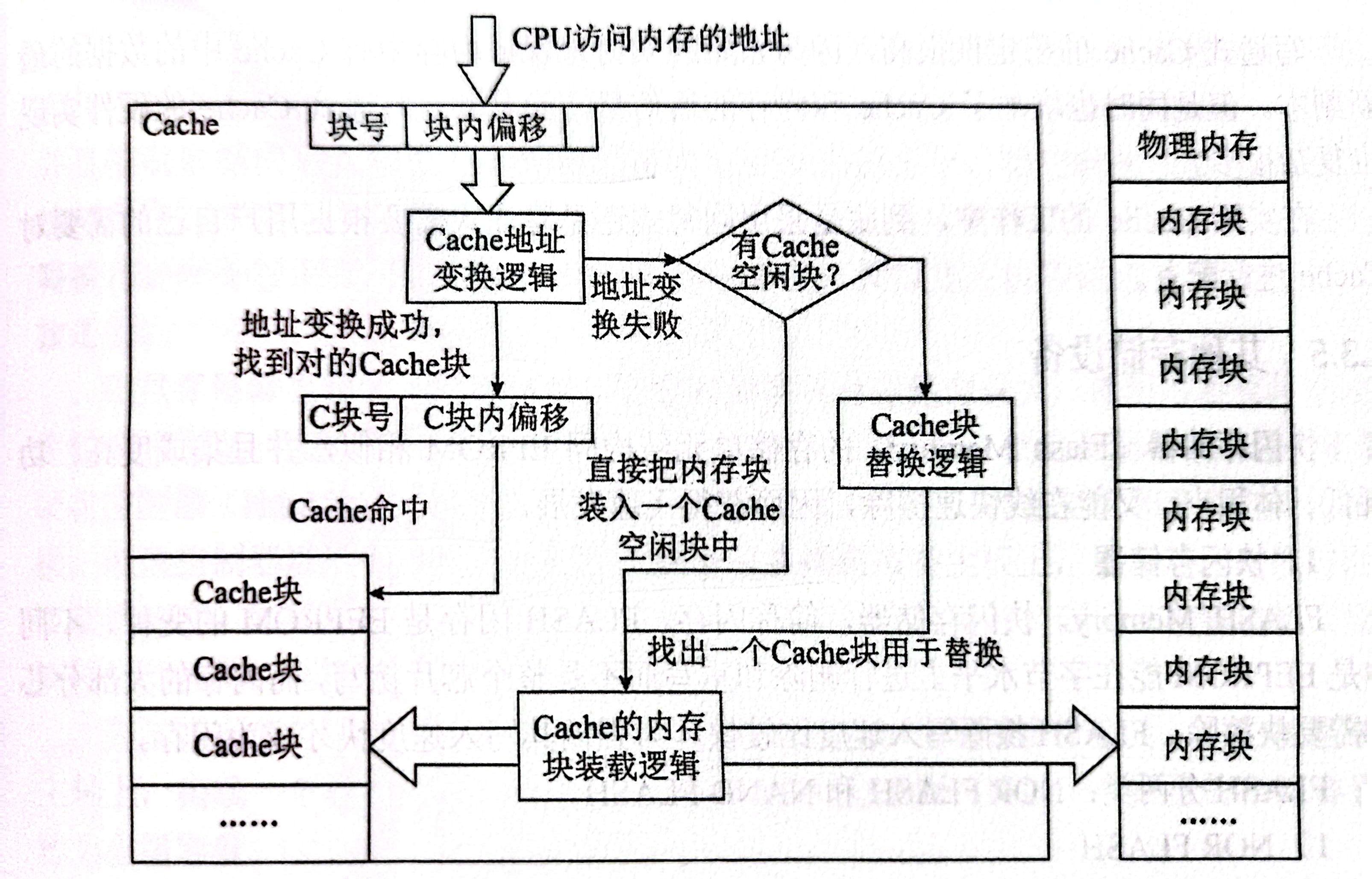 (8) 如果在(6)过程中没有找到一个空闲块,需要使用Cache 管理中的块替换策略找出Cache中可替换出去的块。如果CPU是读内存操作,那么根据替换块的块号和状态Cache会决定是否把这个块回写到内存中(或者直接废除),最后在该替换出去的块中装入CPU访问内存地址对应的内存块,同时把这个地址对应的数据返回给CPU。如果CPV 是写内存操作,根据Cache的类型不同,Cache的动作也会不同。