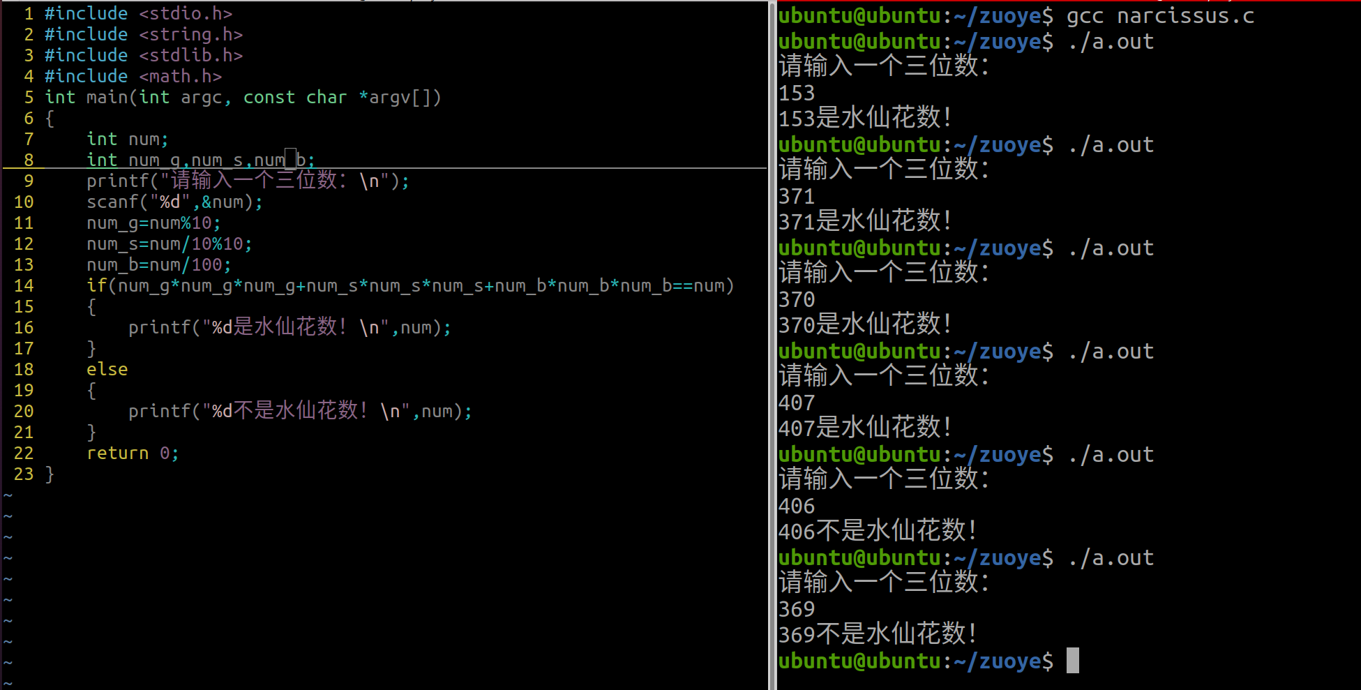 #include <stdio.h> #include <string.h> #include <stdlib.h> #include <math.h> int main(int argc, const char *argv[]) { int num; int num_g,num_s,num_b; printf("请输入一个三位数:\n"); scanf("%d",&num); num_g=num%10; num_s=num/10%10; num_b=num/100; if(num_g*num_g*num_g+num_s*num_s*num_s+num_b*num_b*num_b==num) { printf("%d是水仙花数!\n",num); } else { printf("%d不是水仙花数!\n",num); } return 0; }运行结果:
