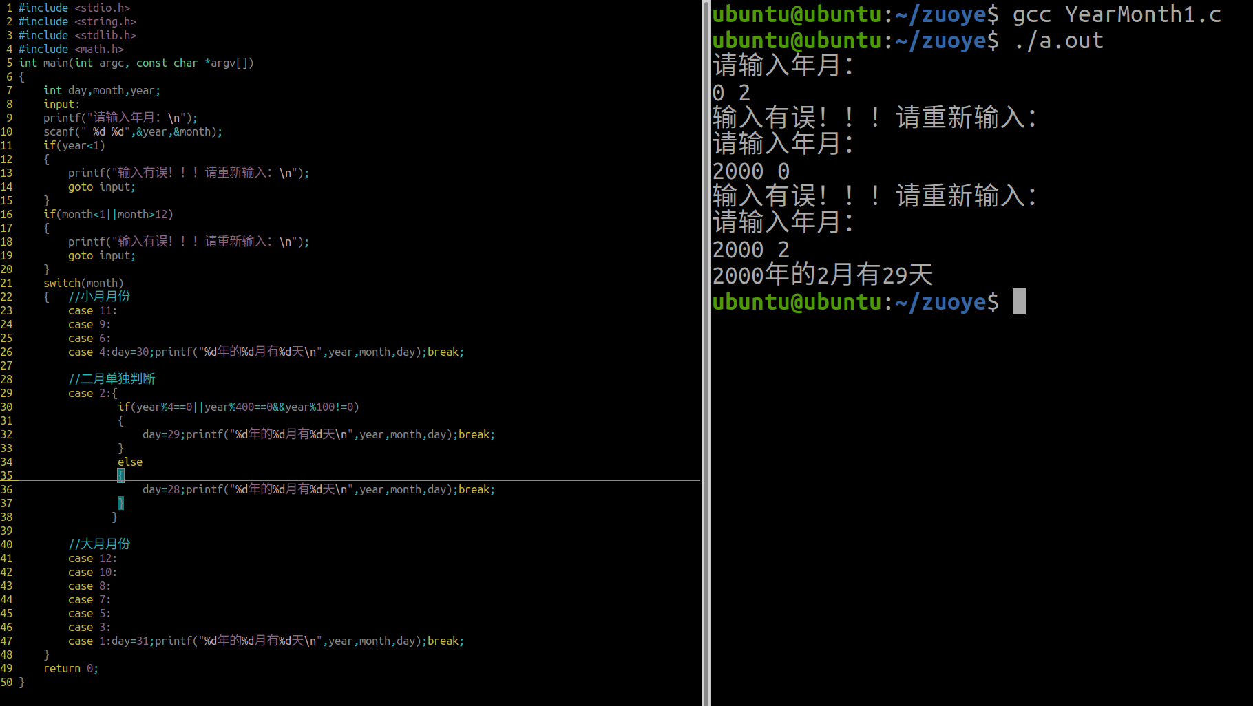 #include <stdio.h> #include <string.h> #include <stdlib.h> #include <math.h> int main(int argc, const char *argv[]) { int day,month,year; input: printf("请输入年月:\n"); scanf(" %d %d",&year,&month); if(year<1) { printf("输入有误!!!请重新输入:\n"); goto input; } if(month<1||month>12) { printf("输入有误!!!请重新输入:\n"); goto input; } switch(month) { //小月月份 case 11: case 9: case 6: case 4:day=30;printf("%d年的%d月有%d天\n",year,month,day);break; //二月单独判断 case 2:{ if(year%4==0||year%400==0&&year%100!=0) { day=29;printf("%d年的%d月有%d天\n",year,month,day);break; } else { day=28;printf("%d年的%d月有%d天\n",year,month,day);break; } } //大月月份 case 12: case 10: case 8: case 7: case 5: case 3: case 1:day=31;printf("%d年的%d月有%d天\n",year,month,day);break; } return 0; }运行结果: