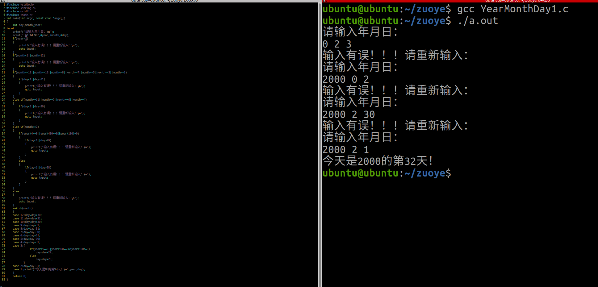 #include <stdio.h> #include <string.h> #include <stdlib.h> #include <math.h> int main(int argc, const char *argv[]) { int day,month,year; input: printf("请输入年月日:\n"); scanf(" %d %d %d",&year,&month,&day); if(year<0) { printf("输入有误!!!请重新输入:\n"); goto input; } if(month<1||month>12) { printf("输入有误!!!请重新输入:\n"); goto input; } if(month==12||month==10||month==8||month==7||month==5||month==3||month==1) { if(day<1||day>31) { printf("输入有误!!!请重新输入:\n"); goto input; } } else if(month==11||month==9||month==6||month==4) { if(day<1||day>30) { printf("输入有误!!!请重新输入:\n"); goto input; } } else if(month==2) { if(year%4==0||year%400==0&&year%100!=0) { if(day<1||day>29) { printf("输入有误!!!请重新输入:\n"); goto input; } } else { if(day<1||day>28) { printf("输入有误!!!请重新输入:\n"); goto input; } } } else { printf("输入有误!!!请重新输入:\n"); goto input; } switch(month) { case 12:day=day+30; case 11:day=day+31; case 10:day=day+30; case 9:day=day+31; case 8:day=day+31; case 7:day=day+30; case 6:day=day+31; case 5:day=day+30; case 4:day=day+31; case 3:{ if(year%4==0||year%400==0&&year%100!=0) day=day+29; else day=day+28; } case 2:day=day+31; case 1:printf("今天是%d的第%d天!\n",year,day); } return 0; }运行结果: