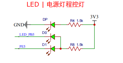 - KEY1 按键:连接 PE3 引脚,一端接地,按下时 PE3 引脚检测到低电平,未按下时由电路配置为上拉输入,保持高电平 。