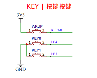 - KEY0 按键:连接 PE4 引脚,一端接地,按下时 PE4 引脚检测到低电平,未按下时由电路配置为上拉输入,保持高电平 。