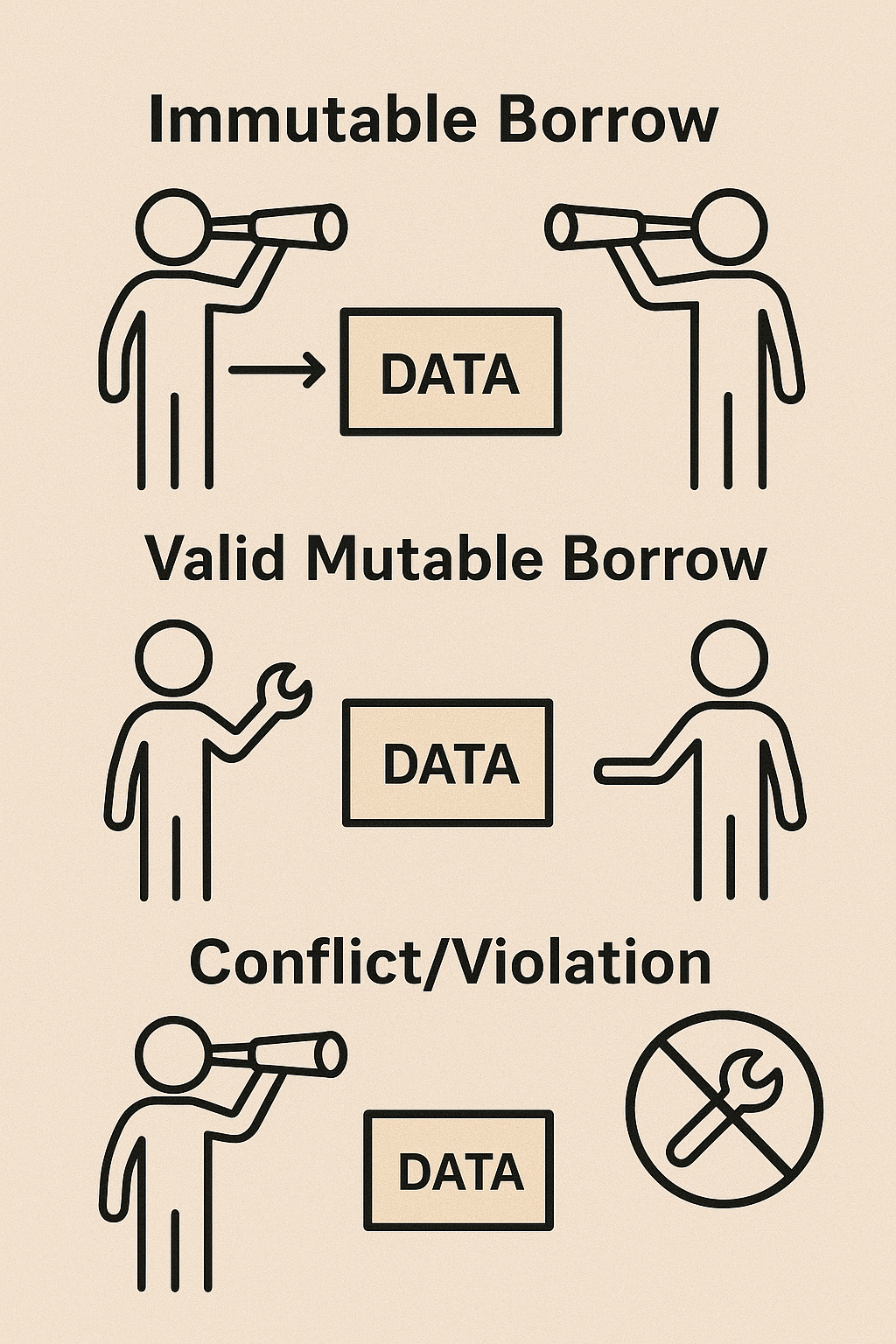 - 借用允许安全地共享数据,通过编译时检查杜绝了数据竞争。