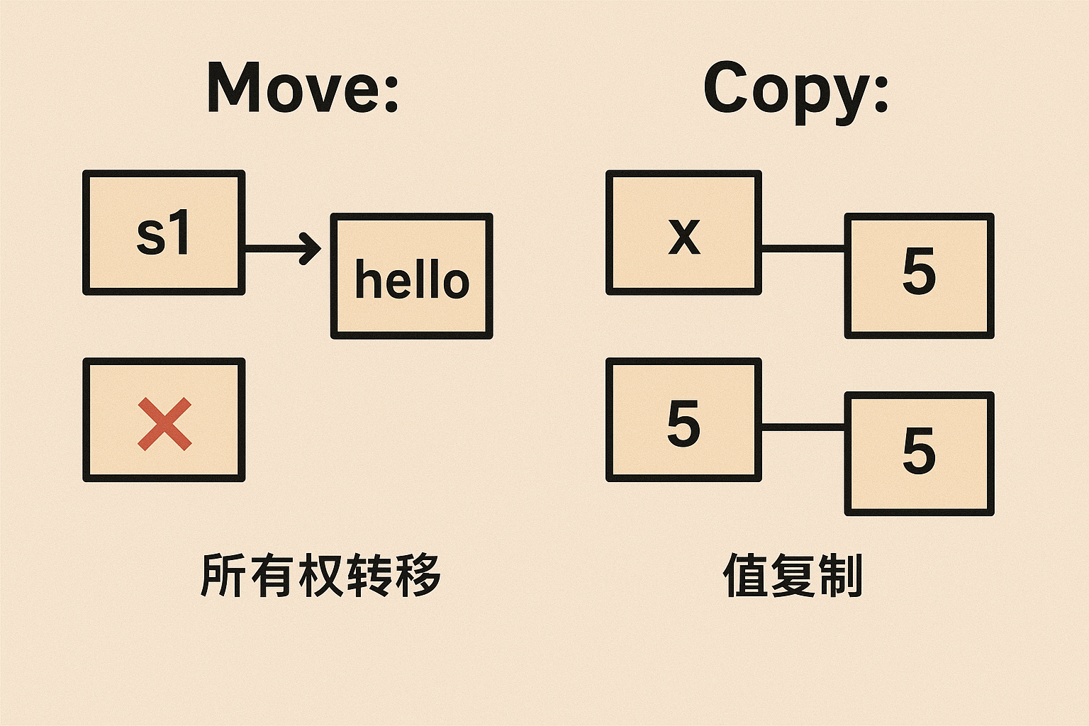 并非所有类型都遵循 Move 语义。对于实现了 Copy trait 的类型(如整数、布尔值、字符、浮点数以及只包含 Copy 类型的元组),赋值操作会进行复制(Copy),而不是移动。