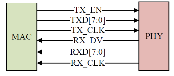 TX_EN、RX_ER、RX_DV、CRS 和COL 的作用同MII 接口中的一样,发送参考时钟GTX_CLK