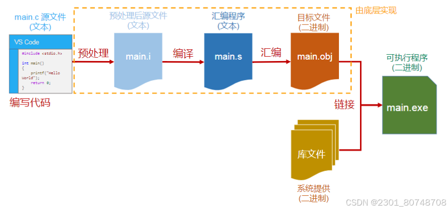 编写代码 --> 预处理 --> ()-->()--> 链接 --> 运行