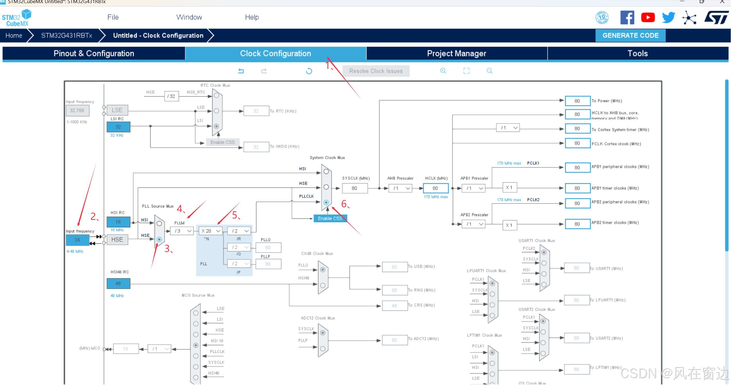 时钟树的配置方法不单图中所示,可以通过调节第4、第5步的地方保证SYSCLK(MHz)处的频率为80,符合蓝桥杯题目要求即可,如果题目要求其他频率也可通过这些地方调整达到题目要求。