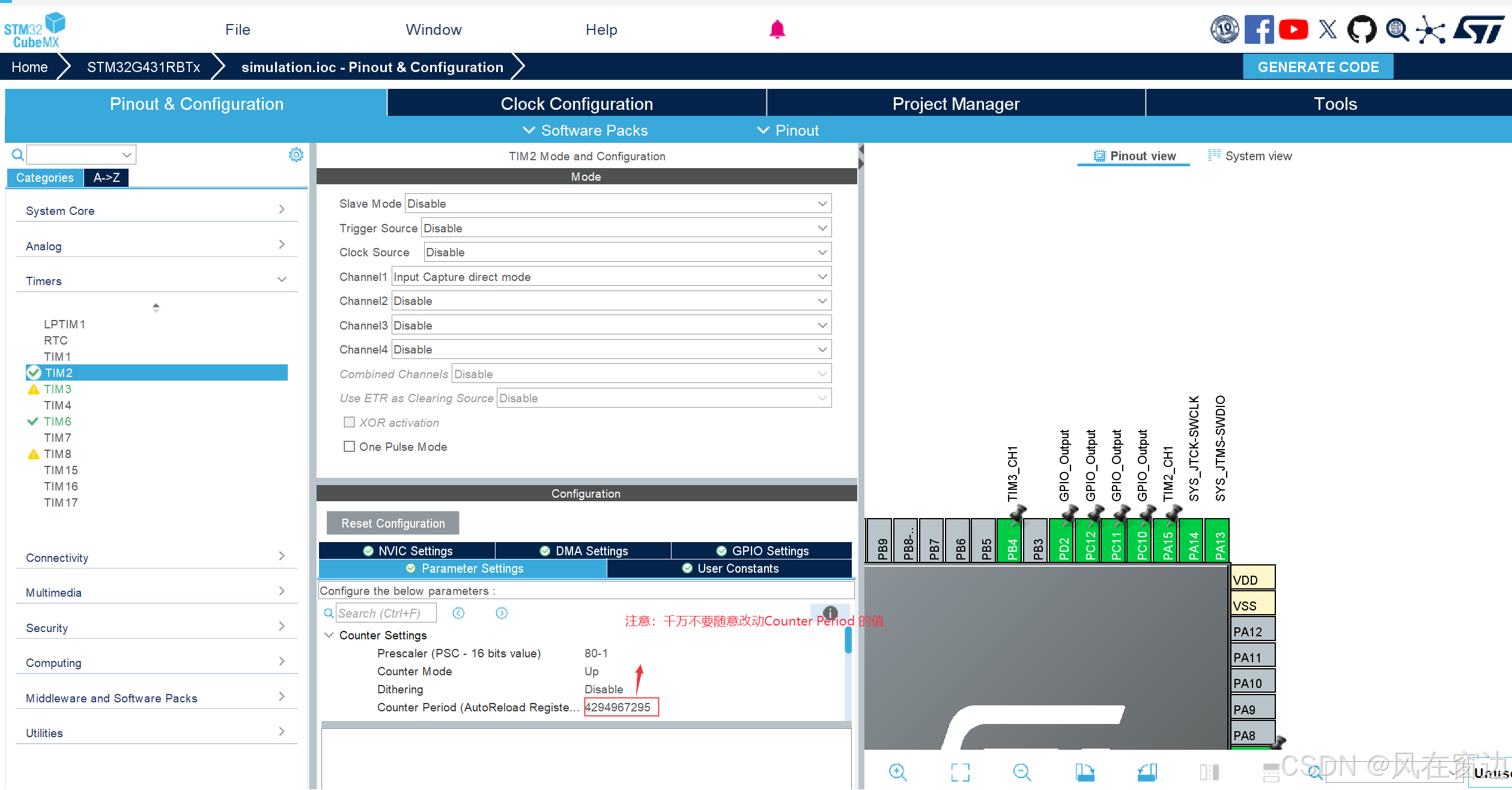 例:系统为80MHz,pa7=1000,配置的预分频值为80-1,那么重装载值就为1000000/1000-1=1000-1。频率f=80000000/1000/80=1000。