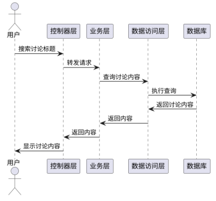 用户在社区互动页面搜索感兴趣的讨论标题。控制器层接收到搜索请求后,将其发送给业务层。业务层通过数据访问层接口查询数据库中的相关讨论内容。查询结果返回给业务层,然后传递给控制器层,最后由控制器层将讨论内容展示给用户。社区互动时序图如图3.8所示。
