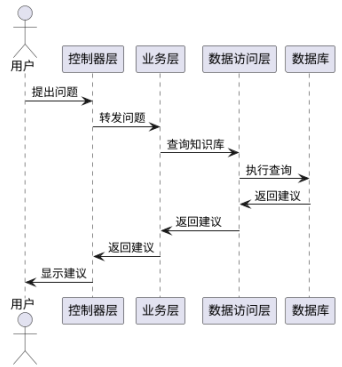 用户在智能助手页面提出养护相关的问题。控制器层接收到问题后,将其传递给业务层。业务层调用数据访问层的接口,从知识库中获取建议。获取到的建议返回给业务层,再由业务层传递给控制器层,最终控制器层将建议反馈给用户。智能助手时序图如图3.7所示。