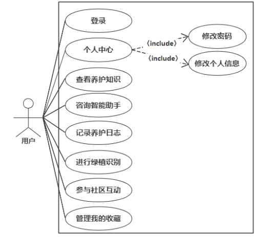 用户系统:主要功能模块有查看养护知识、参与社区互动、咨询智能助手、记录养护日志、进行绿植识别、参与社区互动、管理我的收藏、管理个人中心等。用户用例图如图2.2所示。