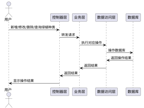 绿植种类管理功能允许用户新增、修改、删除和查询平台中的绿植品种。通过新增功能,用户可以将新的绿植品种添加到系统中,修改功能可更新植物的名称、类型、养护要求等信息,删除功能可以去除不再需要的品种,查询功能帮助用户快速查找并管理已有的植物种类。绿植种类管理时序图如图3.4所示。
