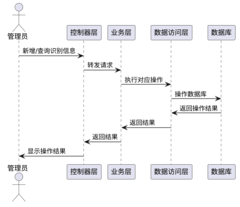 管理员进入绿植识别管理功能模块,在此模块中,管理员可以对用户上传的绿植识别信息进行管理。比如新增识别信息时,管理员在系统界面录入相关识别信息,系统将信息存储到数据库,数据库返回存储结果,系统告知管理员操作是否成功;查询识别信息时,管理员输入查询条件,系统从数据库获取数据并展示给管理员。绿植识别管理时序图如图3.4所示。