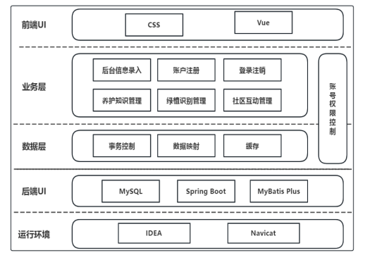 本系统采用前后端分离的架构,前端使用Vue和CSS开发,能够提供良好的用户界面。用户通过前端界面进行养护知识浏览、绿植识别、社区互动等操作,前端与后端进行数据交互,提升了系统的可扩展性和可维护性。业务层主要负责处理后台信息录入、账户注册、登录注销、养护知识管理、绿植识别功能以及社区互动等,提供了良好的功能模块划分,确保系统在各个方面的高效运行。数据层采用MySQL数据库进行数据存储,使用MyBatis Plus简化数据库操作,确保高效、灵活的数据管理。为了提升系统性能,数据层还包括事务控制和缓存机制,以保障数据的一致性和响应速度。后台服务采用Spring Boot框架进行搭建,具备快速开发、自动配置等优势,同时集成MyBatis Plus,简化数据库操作,提高开发效率。开发环境中,IDEA作为主力开发工具,提供丰富的功能支持,Navicat则用于数据库的管理和操作。整体架构的设计充分考虑了系统的功能需求和性能要求,保证了系统的稳定性和扩展性。整体架构设计如图3.2所示。