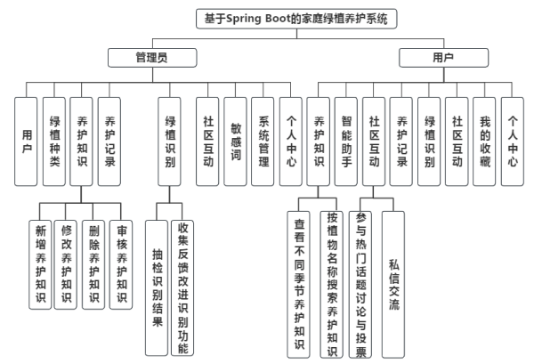 在基于Spring Boot的家庭绿植养护系统中,用户和管理员的功能结构有所区别。用户系统的功能主要集中在绿植养护的知识获取和互动交流上,包括通过养护知识模块查询和学习植物养护知识、参与社区互动发布和查看评论、利用智能助手获取养护建议、记录和查询养护日志、上传并识别绿植图片、管理收藏的内容、以及通过个人中心修改个人信息等功能。这些功能结构为用户提供了丰富的绿色植物管理和互动体验,方便更好地照料和了解植物。管理员系统则主要负责后台的管理与维护工作,功能包括对用户数据的管理、绿植种类的增删改查、养护知识和记录的管理、绿植识别结果的审核、社区互动内容的审核和管理、敏感词的监控与修改,以及系统的日志和菜单管理等。管理员通过个人中心功能可修改自己的账户信息,确保后台管理的安全性和有效性[18]。系统功能结构图如图3.1所示。