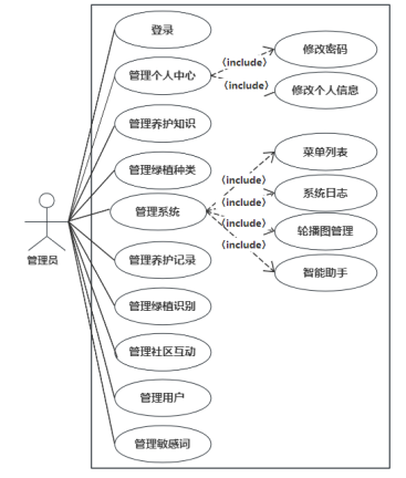 管理员系统:系统中的核心用户是管理员,管理员登录后,通过管理员功能来管理后台系统的各项功能如用户、绿植种类、养护知识、养护记录、绿植识别、社区互动、敏感词、系统管理、个人中心等。管理员用例图如图2.1所示