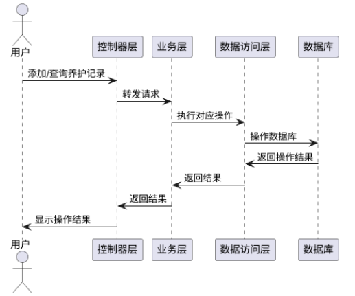用户在养护记录页面添加或查询养护日志。控制器层接收到操作请求后,将其发送给业务层。业务层调用数据访问层的接口,执行添加或查询操作。操作结果返回给业务层,然后传递给控制器层,最后由控制器层将结果展示给用户,完成养护日志的管理。养护记录管理时序图如图3.6所示。