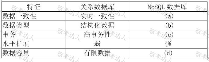 李工方案中给出了关系数据库与NoSQL数据的比较,如表4-1所示,以此来说明该新闻社交类软件更适合采用NoSQL数据库。请完成表4-1中的(a) ~ (d)处空白。