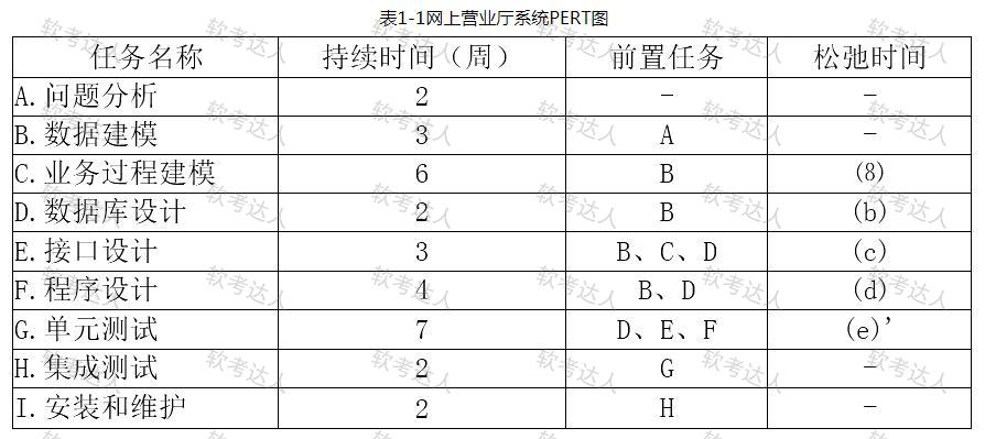 某软件企业为电信公司开发一套网上营业厅系统,以提升服务的质量和效率。项目组经过分析,列出了项目开发过程中的主要任务、持续时间和所依赖的前置任务,如表1-1所示。在此基础上,绘制了项目PERT图。