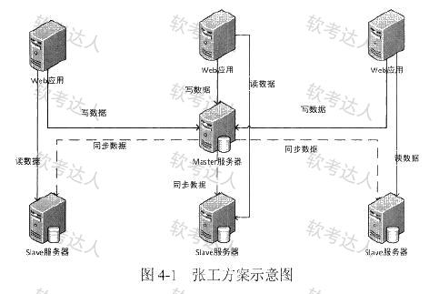 张工提出对MySQL数据库进行扩展,采用读写分离,主从复制的策略,好处是程序改动比较小,可以较快完成,后续也可以扩展到MySQL集群,其方案如图4-1所示。李工认为该系统的诸多功能,并不需要采用关系数据库,甚至关系数据库限制了功能的实现,应该采用NoSQL数据库来替代MySQL,重新构造系统的数据层。而刘工认为张工的方案过于保守,对该系统的某些功能,如关注列表、推荐列表、热搜榜单等实现困难,且性能提升不大;而李工的方案又太激进,工作量太大,短期无法完成,应尽量综合二者的优点,采用Key-Value数据库+MySQL数据库的混合方案。