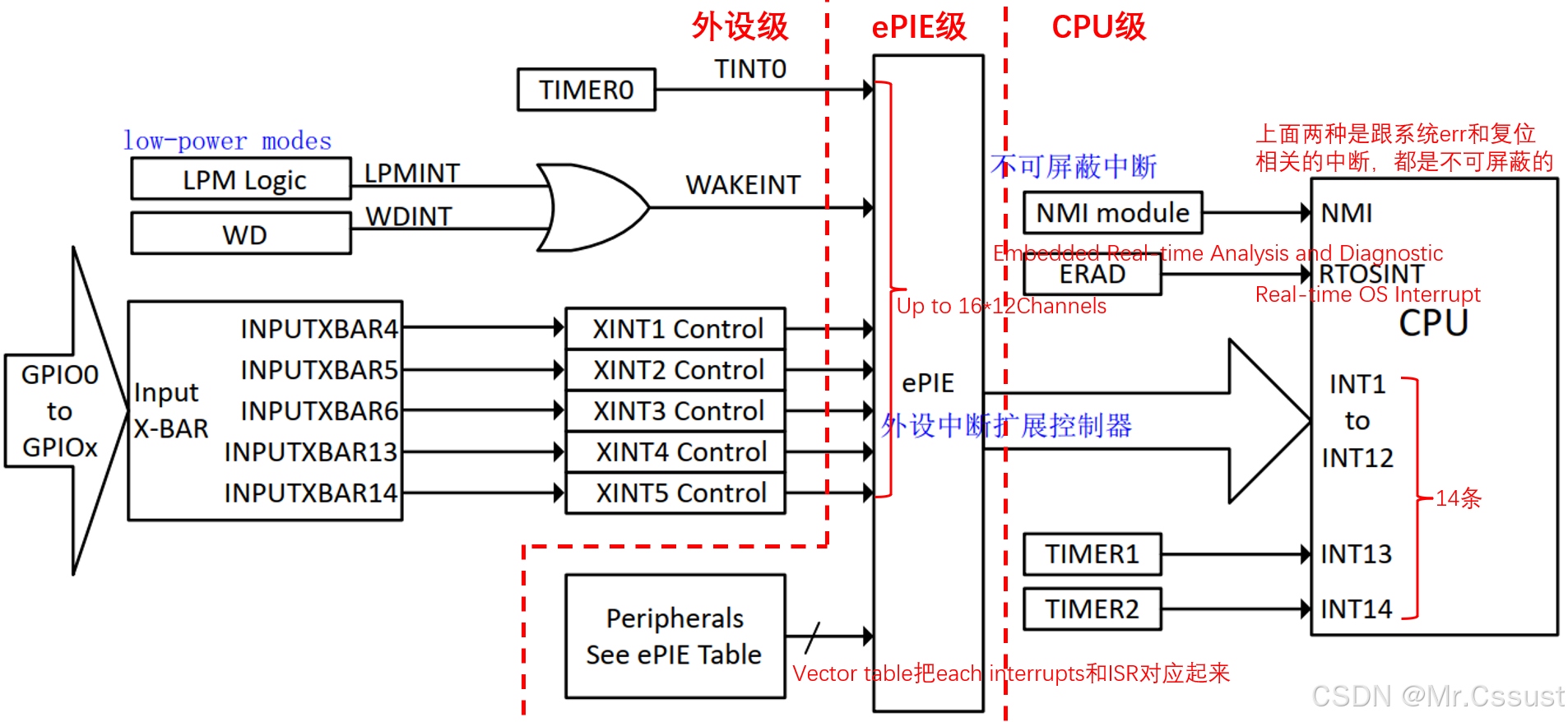 图1:STM32中断系统三层架构(NVIC-外设-事件)*:优先级分组(4bit抢占/4bit响应):GPIO与中断线的复用关系(如PA0→EXTI0)的注册原理。