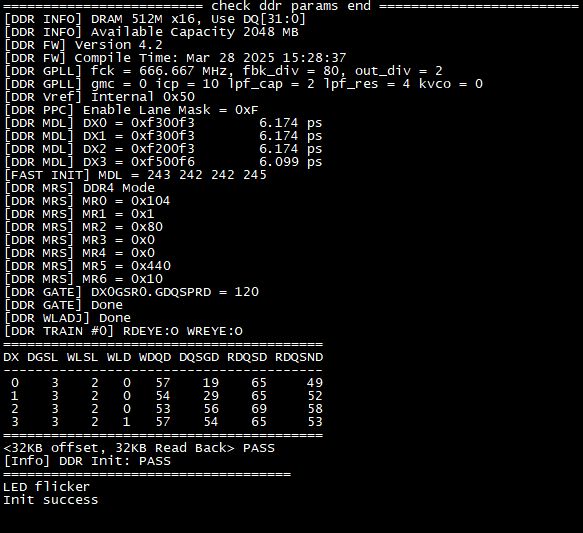 请参考《TD-FD端工程编译与加载》文档“FD工程的程序加载、创建与编译”章节,完成程序的加载。加载完成后看到串口终端打印如下信息,同时可观察到评估底板的LED2进行闪烁。