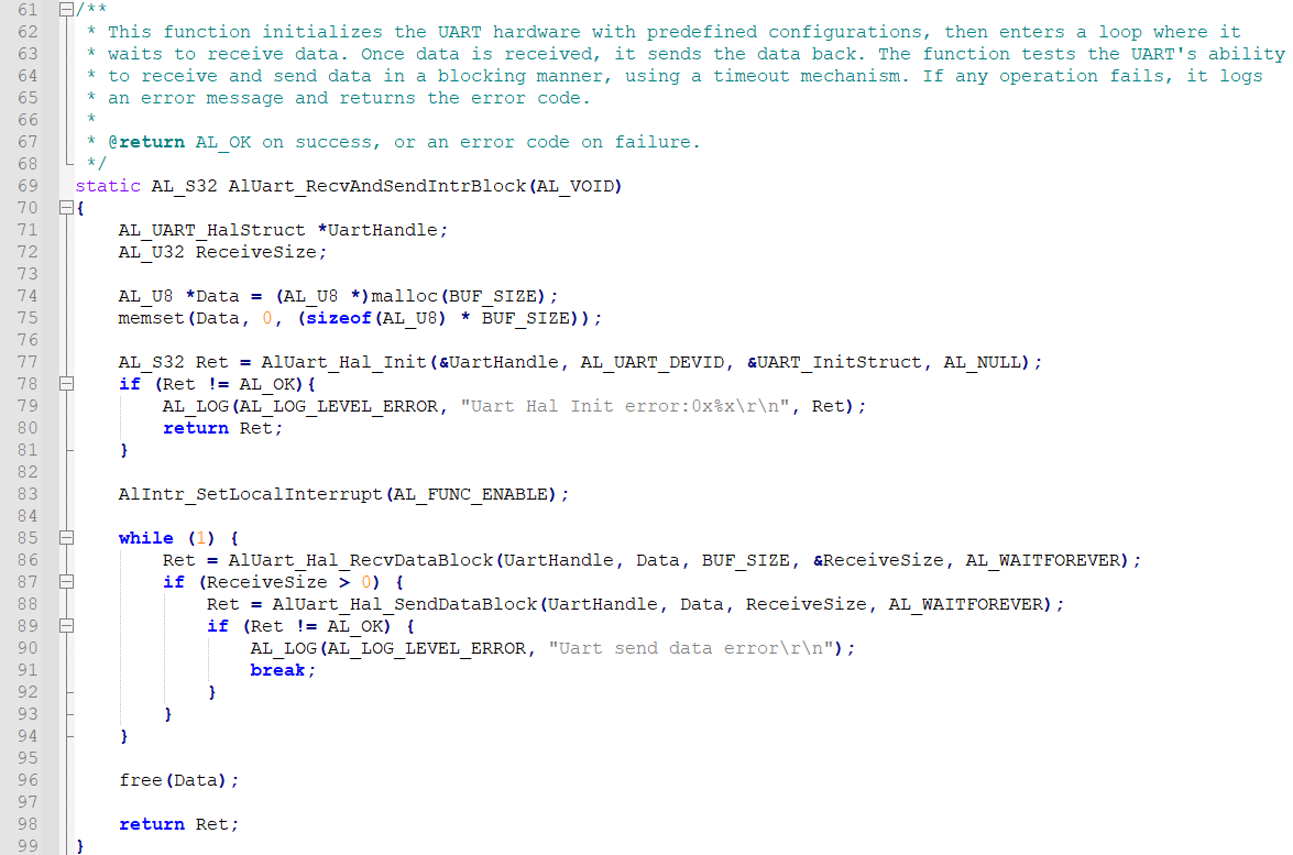 (2)使UART处于阻塞状态,通过调用AlUart_Test_RecvAndSendIntrBlock函数执行测试,并记录结果。若测试失败,则记录错误消息并返回错误代码,否则,记录成功消息并返回AL_OK。