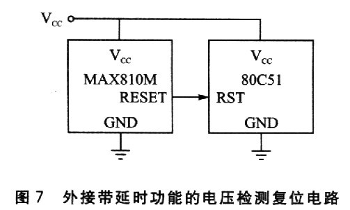 MAX810x(x=L、M、J、T、S或R)是美国Maxim公司研制的一组CMOS电源监控电路,能够为低功耗微控制器MCU(或μC)、微处理器 MPU(或μP)或数字系统监视3~5V的电源电压。在电源上电、断电和跌落期间产生脉宽不低于140ms的复位脉冲。与采用分立元件或通用芯片构成的欠压检测电路相比,将电压检测和复位延时等功能集成到一片3引脚封装的小芯片内,大大降低了系统电路的复杂性,减少了元器件的数量,显著提高了系统可靠性和精确度。应用电路如图7所示。