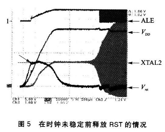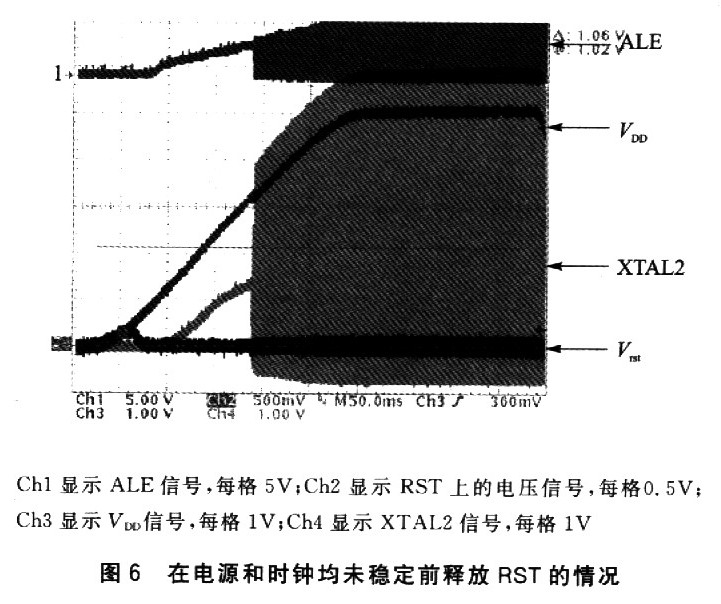 ②在电源电压还没有上升到合适范围之前(自然也是时钟尚未稳定之前),就释放RST信号的锁定状态,将会使单片机永远感受不到复位信号、经历不到复位过程、包含PC在内的各个SFR内容没有被初始化而保留了随机值,从而导致CPU从一个随机地址开始执行程序,进而也陷入混乱状态。参考图6所示的实测信号曲线。