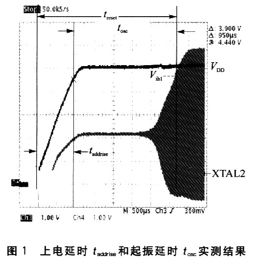 在单片机电源电压上升到适合内部振荡电路运行的范围并且稳定下来之后,时钟振荡器开始了启动过程(具体包括偏置、起振、锁定和稳定几个过程)。该过程所持续的时间一般为1~50 ms(记作tOSC)。起振延时tOSC的定义是时钟振荡器输出信号的高电平达到Vih1所需的时间。从图1所示的实际测量图中也可以看得很清楚。这里的 Vih1是单片机电气特性中的一个普通参数,代表XTALl和RST引脚上的输入逻辑高电平。例如,对于常见的单片机型号AT89C5l和 AT89S5l,厂家给出的Vih1值为0.7VDD~VDD+0.5V。