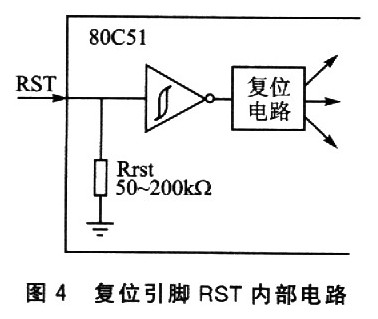 标准80C5l不仅复位源比较单一,而且还没有设计内部上电复位的延时功能,因此必须借助于外接阻容支路来增加延时环节,如图3(a)所示。其实,外接电阻R还是可以省略的,理由是一些CMOS单片机芯片内部存在一个现成的下拉电阻Rrst。例如,AT89系列的Rrst阻值约为50~200kΩ; P89V51Rx2系列的Rrst阻值约为40~225 kΩ,如图4所示。因此,在图3(a)基础上,上电复位延时电路还可以精简为图3(b)所示的简化电路(其中电容C的容量也相应减小了)。