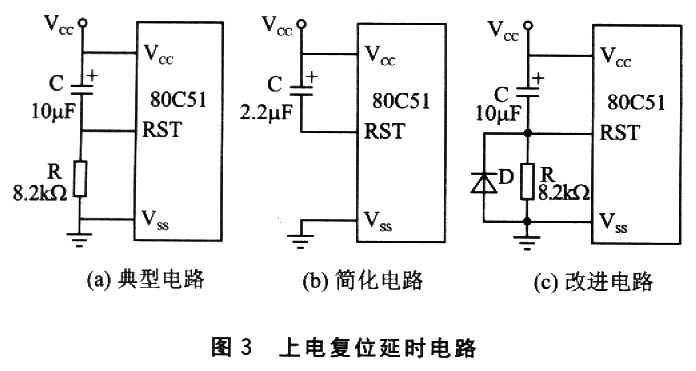 在每次单片机断电之后,须使延时电容C上的电荷立刻放掉,以便为随后可能在很短的时间内再次加电作好准备。否则,在断电后C还没有充分放电的情况下,如果很快又加电,那么RC支路就失去了它应有的延迟功能。因此,在图3(a)的基础上添加一个放电二极管D,上电复位延时电路就变成了如图3(c)所示的改进电路。也就是说,只有RC支路的充电过程对电路是有用的,放电过程不仅无用,而且会带来潜在的危害。于是附加一个放电二极管D来大力缩短放电持续时间,以便消除隐患。二极管D只有在单片机断电的瞬间(即VCC趋近于0V,可以看作VCC对地短路)正向导通,平时一直处于反偏截止状态。