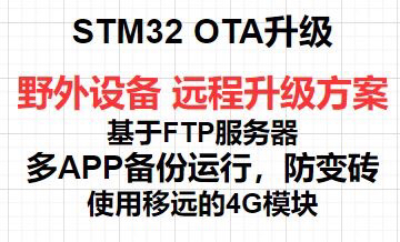stm32 IAP升级 OTA升级 野外设备远程升级 自建FTP服务器升级 多App备份 切换,防变砖 芯片 stm32f103系列 4G模块 EC200T 程序简介:一个bootloader程序 多个主程序程序可相互切换 主程序A 出厂前烧录,永不更改,用于升级失败后,做应急程序使用,保障单片机不变砖 主程序B 日常运行,可升级替换 主程序C 功能与主程序B相同 三个主程序间可通过上位机远程控制,切换运行 单片机通过4G模块远程下载服务器上的BIN文件,通过BIN文件数据自动判断程序应该烧录的flash位置进行升级,升级成功后自动跳转到新程序。 本程序升级流程清晰,多重防范措施避免单片机因为升级而变砖,保证系统正常运行。 无论你想要通过什么方式升级,只需要自己修改数据的接收方式,搭配我的固件处理代码,可有效保证系统稳定运行。 可以得到 bootloader和app的源码,上位机EXE文件,详细的说明书文档(附带如何自己搭建FTP服务器)