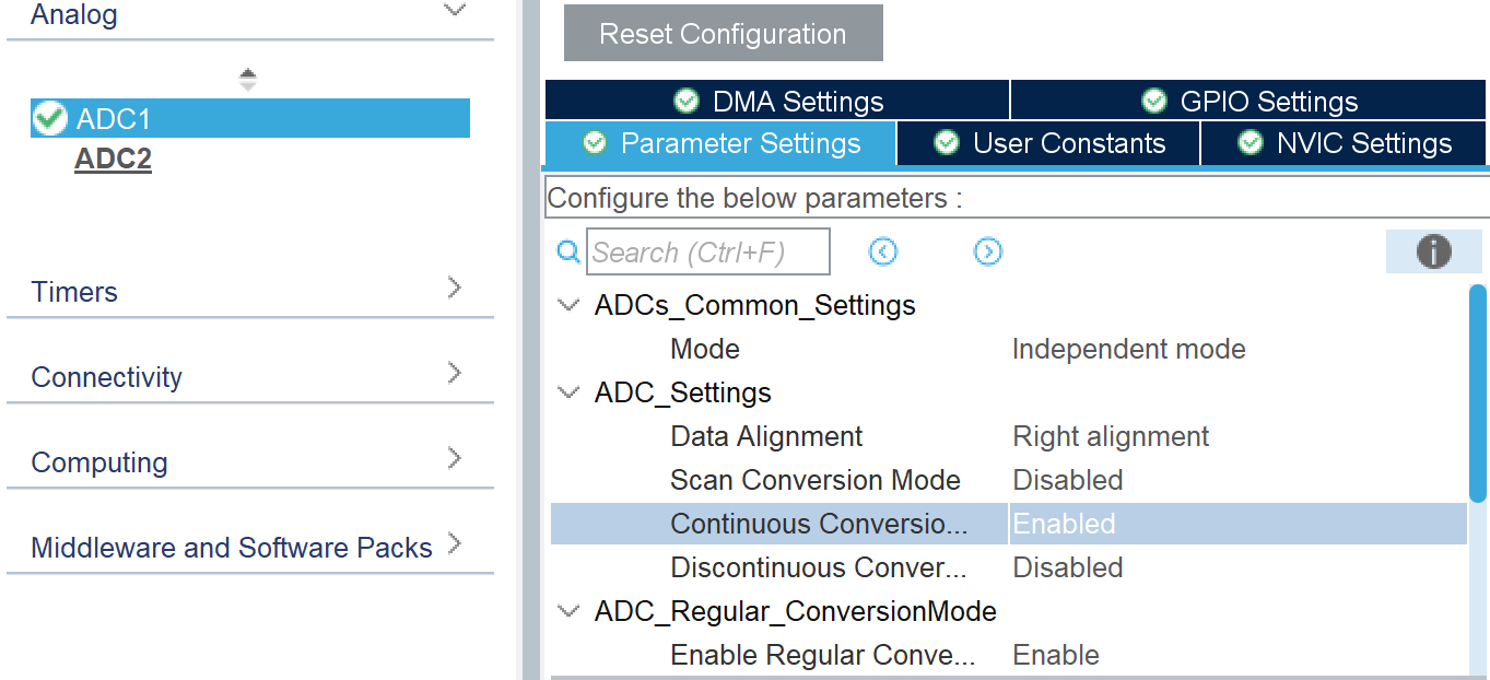 - 找到 ADC_Regular_ConversionMode(规则组转换模式)这一栏。