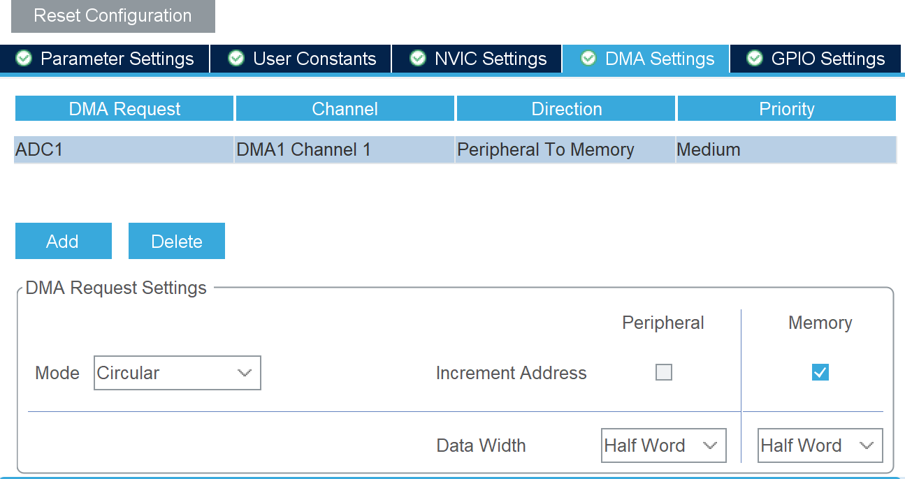 Half Word(16bit),因为 ADC 数据是 12位的,需要用 16位存。 - Memory Increment: 勾选 (每次搬运后,内存地址+1,存到数组下一个位置)。