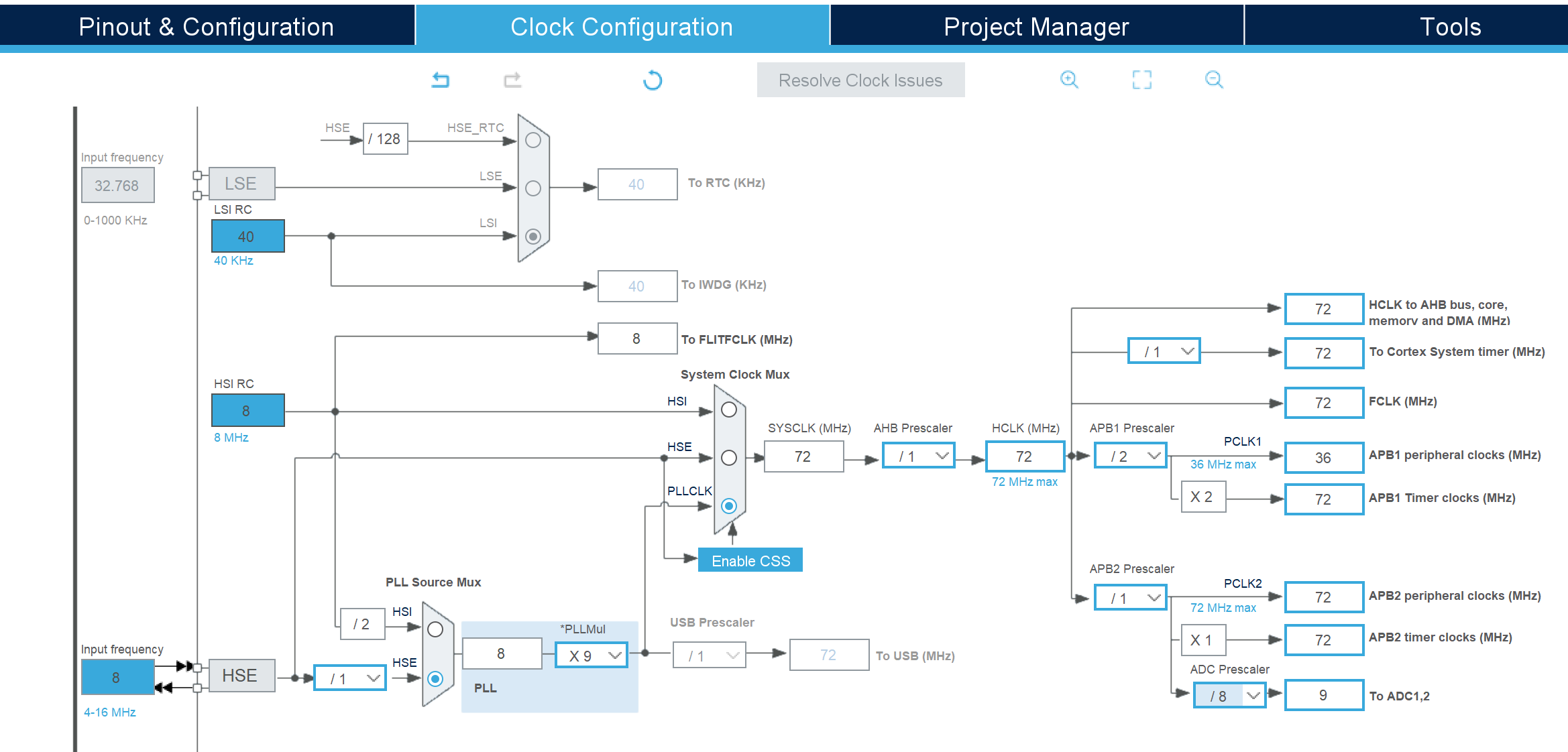 - 系统主频通常是 72MHz。