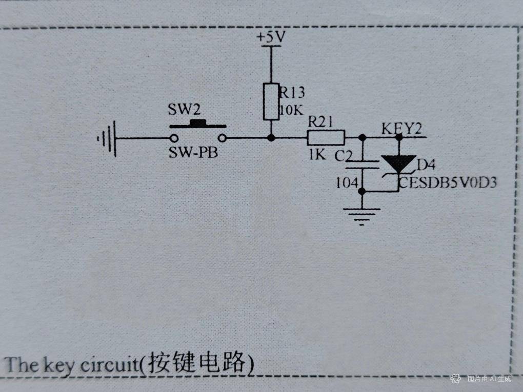 - 电容 C2 上储存的电荷,通过 R21 和按键对地放电,RC 滤波电路滤除按键按下瞬间弹片产生的高频抖动毛刺,让 KEY2 引脚的电平平滑、无跳变地从 5V 降至 0V;