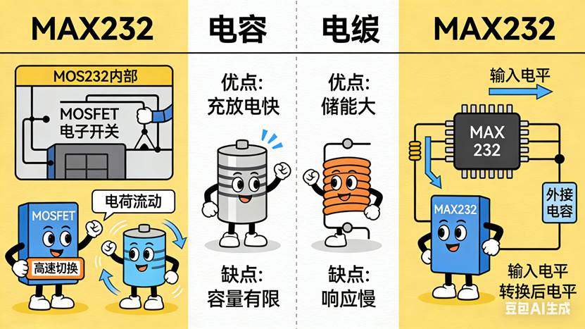 没有机械运动,只有电子在电容之间“跳来跳去”。为什么不用电感?有人问:DC-DC用电感效率更高,为什么MAX232偏要用电容?因为电感贵、体积大、有电磁干扰。