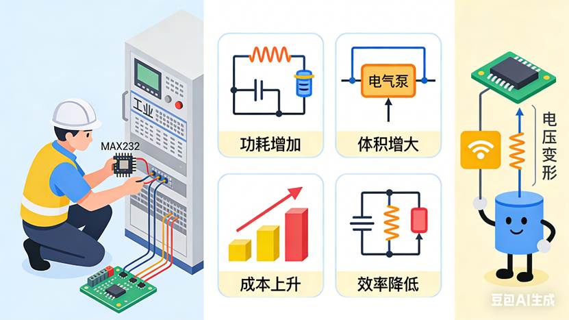 一个真实的“救场”案例,我有个朋友做一款工业控制器,需要和一台老设备通信。老设备是RS232接口,需要±12V。他的板子是3.3V系统,本来想用DC-DC模块升压。结果采购说:DC-DC模块缺货,交期两个月。他翻出MAX232,搭了几个电容——3.3V进去,±10V出来。老设备认这个电压,通信正常。一个几毛钱的芯片,救了两个月的交期。电荷泵的“代价”电荷泵虽好,也有代价。