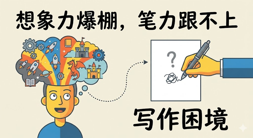 我想你应该跟我一样,有过这种时刻:脑子里剧情跑得飞快,简直是史诗级大片,画面感很足,但手放在键盘上,憋了俩小时,1000多字就把男子里的小说情节全过完了;总觉得文笔跟不上想法,写出来的小说读起来沉浸感大打折扣。